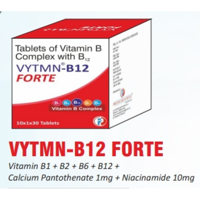DESCRIPTION - VYTMN-B12 FORTE is a multivitamin B-complex formulation that supports energy metabolism and neurological function. B-vitamins play a crucial role in carbohydrate, protein, and fat metabolism, aiding in energy production. Vitamin B12 and B6 support nerve health and red blood cell formation, while Niacinamide and Calcium Pantothenate enhance metabolic activity and immune function. Together, they help maintain overall vitality and immune strength.