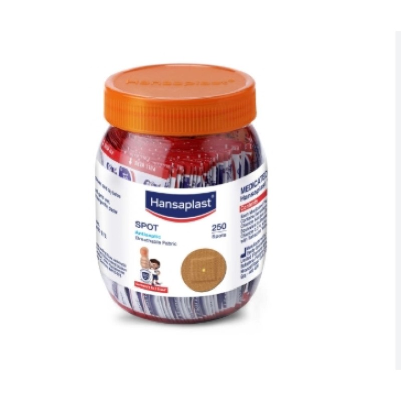 Hansaplast Spot strips are small, round medicated adhesive plasters designed to protect minor cuts, small wounds, and injection sites. They contain an antiseptic absorbent pad that helps prevent infection while the breathable material promotes faster healing. The strong adhesive ensures firm fixation on the skin.